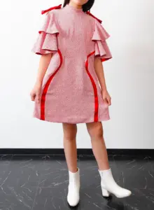 Using the designated material, traditional Japanese crepe (chirimen), I created a design that fuses it with a modern silhouette.